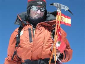 | Carlos Soria, en una cima con las banderas de España, Madrid y Moralzarzal |