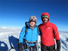 Soria liderará una vez más la expedición, patrocinada por BBVA, e intentará la cima en compañía de Sito Carcavilla, escalador y geólogo, además de compeñero en otras cordadas. Con él subió este sábado a la montaña más alta de Bolivia, el estratovolcán Nevado Sajama, a modo de acilimatación -la imagen superior muestra a ambos en la cumbre-, una subida que Soria calificó de “rápida, más que los vuelos de vuelta”. El regreso totalizó 47 horas de avión.