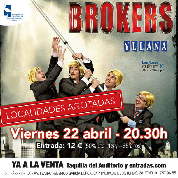 La compañía Yllana vuelve a Las Rozas para presentar su espectáculo “Brokers”, una comedia, para la que se han agotado ya todas las localidades, sobre la carrera hacia el éxito de cuatro hombres de negocios en la era del furor consumista. Se representará este viernes en el Teatro del Centro Cultural Pérez de la Riva a las 20.30 horas.