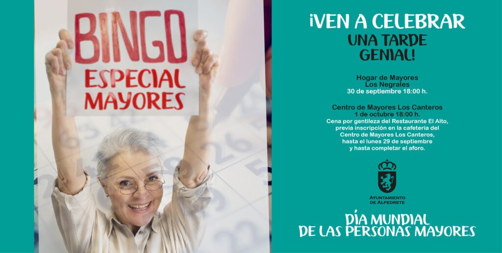 El Ayuntamiento de Alpedrete celebra el Día Mundial de las Personas Mayores organizando un Bingo Especial en dos centros municipales. El evento se llevará a cabo el 30 de septiembre en el Hogar de Mayores Los Negrales y el 1 de octubre en el Centro de Mayores Los Canteros, donde también se ofrecerá una cena cortesía del Restaurante El Alto. Esta celebración busca fomentar la convivencia y diversión entre los mayores, destacando la importancia de este día. La música estará a cargo de Kike Martín Paraíso, quien amenizará la velada.