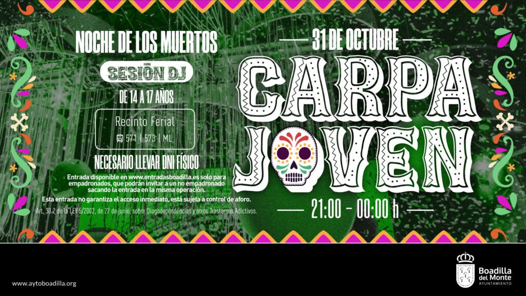 El Ayuntamiento de Boadilla ha anunciado la celebración de una nueva edición de la Carpa Joven, programada para el próximo 31 de octubre, desde las 21:00 hasta las 00:00 horas. Este evento, que tendrá lugar en el Recinto Ferial, está diseñado especialmente para los jóvenes de entre 14 y 17 años empadronados en la localidad.
