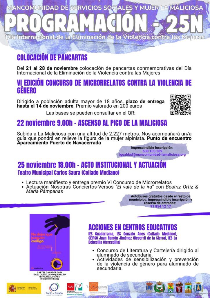 Entre las iniciativas programadas, destaca el ascenso al Pico de la Maliciosa, así como un acto institucional que incluirá la actuación “El vals de la ira”. Además, se llevará a cabo un cuentacuentos con títeres titulado “Ni princesas ni famosas”, previsto para el 11 de diciembre a las 18:00 h en la Biblioteca Municipal.