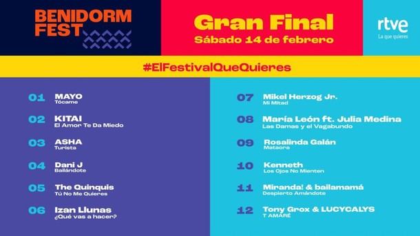 El Benidorm Fest 2026 está a punto de alcanzar su clímax con la gala final, programada para este sábado 14 de febrero. En esta esperada ceremonia, se presentarán las 12 propuestas musicales que han logrado clasificarse en las semifinales. Entre los participantes se encuentran Tony Grox & LUCYCALYS, Izan Llunas, KITAI, Mikel Herzog Jr., Kenneth y María León ft. Julia Medina, así como Miranda!&bailamamá, Dani J, MAYO, Rosalinda Galán, The Quinquis y ASHA.