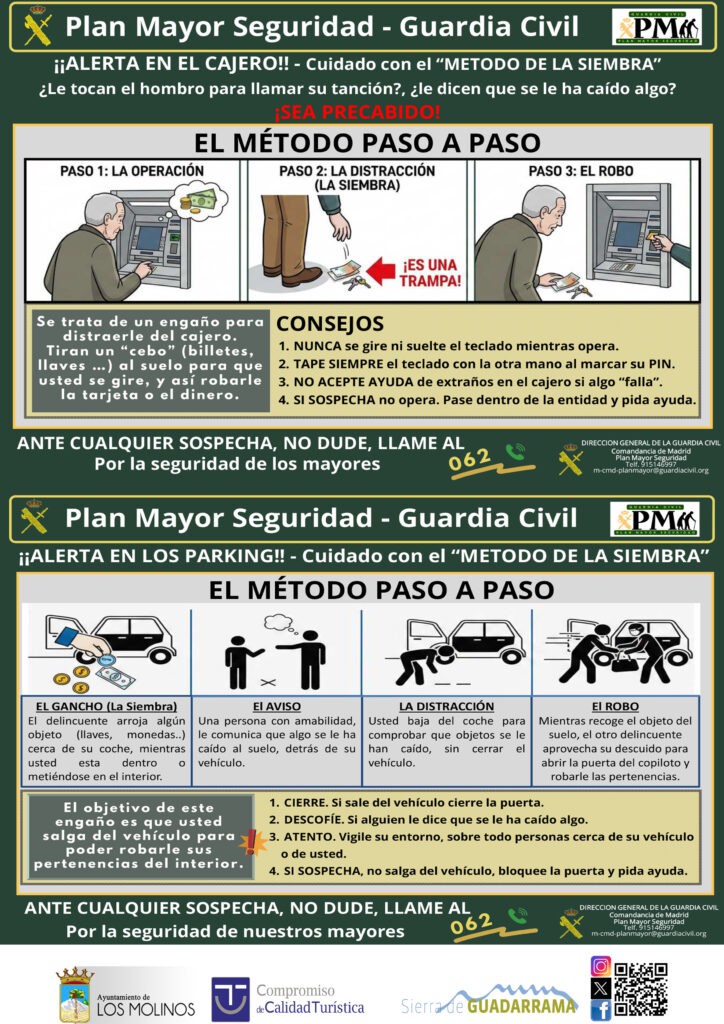 El Ayuntamiento de Los Molinos, en colaboración con la Guardia Civil, ha lanzado una campaña de prevención para proteger a las personas mayores de hurtos en cajeros automáticos y parkings. Esta iniciativa forma parte del Plan Mayor Seguridad y busca alertar sobre el "método de la siembra", una técnica que utilizan delincuentes para distraer a las víctimas mientras realizan operaciones bancarias o estacionan sus vehículos. Se recomienda a los ciudadanos adoptar medidas de seguridad como no soltar el teclado en cajeros, cerrar siempre las puertas del vehículo y desconfiar de desconocidos que ofrezcan ayuda. Ante cualquier sospecha, se aconseja contactar con la Guardia Civil al teléfono 062. La información y la prevención son clave para garantizar la seguridad de los mayores en la comunidad.